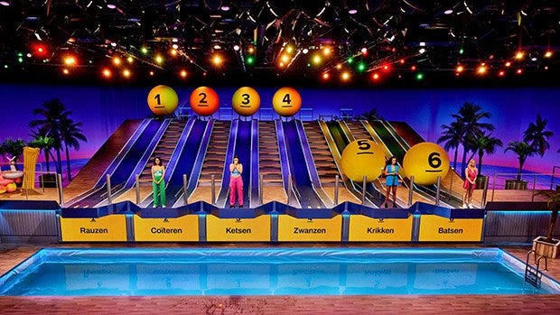 Each question has as many correct answers as the number of players left on the platform. In the case of question 1, that means five correct answers and one wrong answer. With each player falling into the pool, a wrong answer is added to the six answer options of the next question. For each team, the key is to stay as complete as possible for as long as possible since the tenth and final question is worth a huge cash prize (25.000€ in the original version).